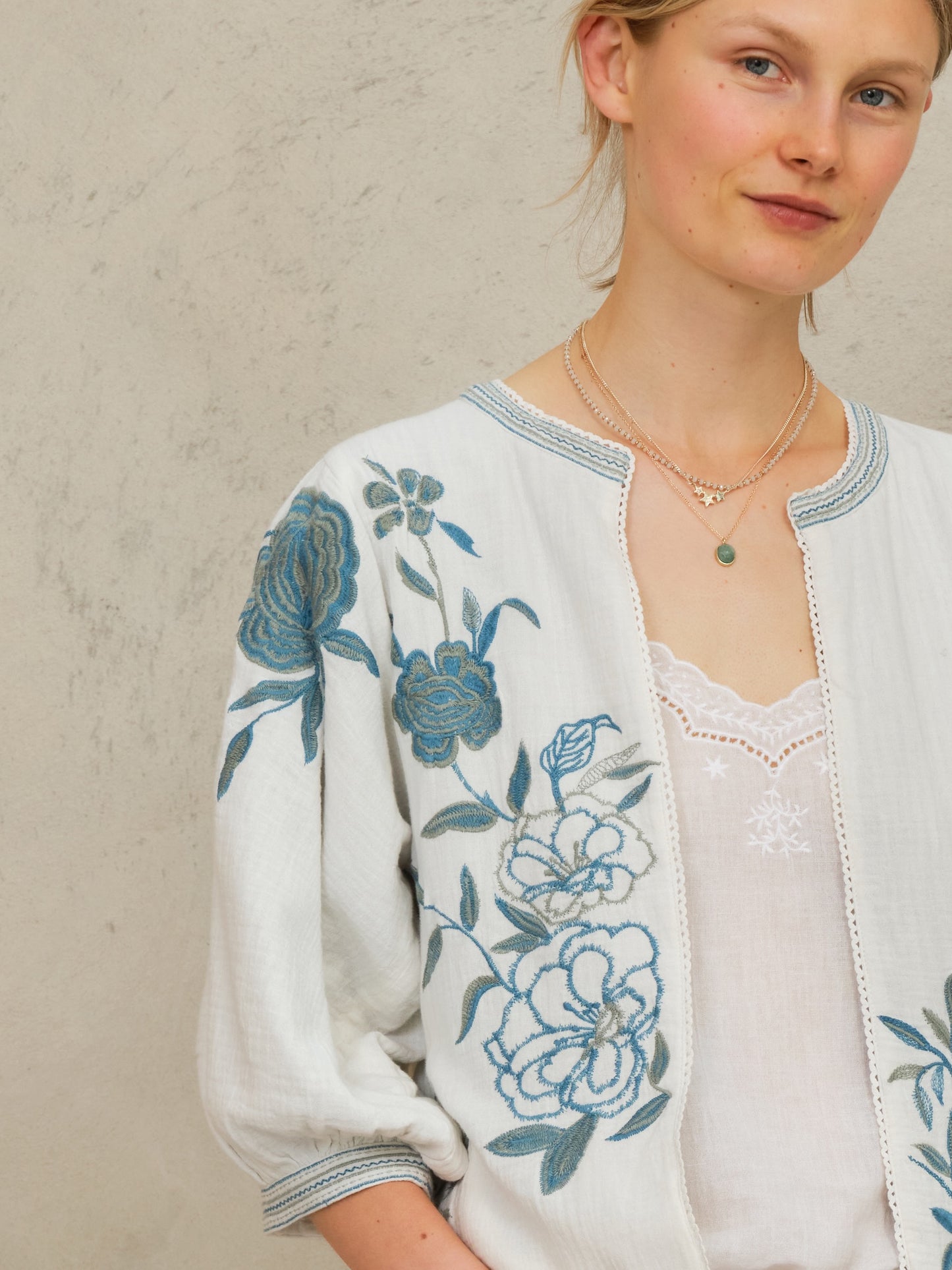 This hand-embroidered jacket features striking floral details in soft ecru and blue tones. Crafted from breathable double gauze cotton with a woven lining, this piece offers both comfort and style. The gathered 3/4 sleeves and body gathers create an effortlessly elegant silhouette, while convenient side slip pockets add everyday functionality. Perfect for layering or wearing solo, this versatile jacket brings artisanal charm to any outfit.
